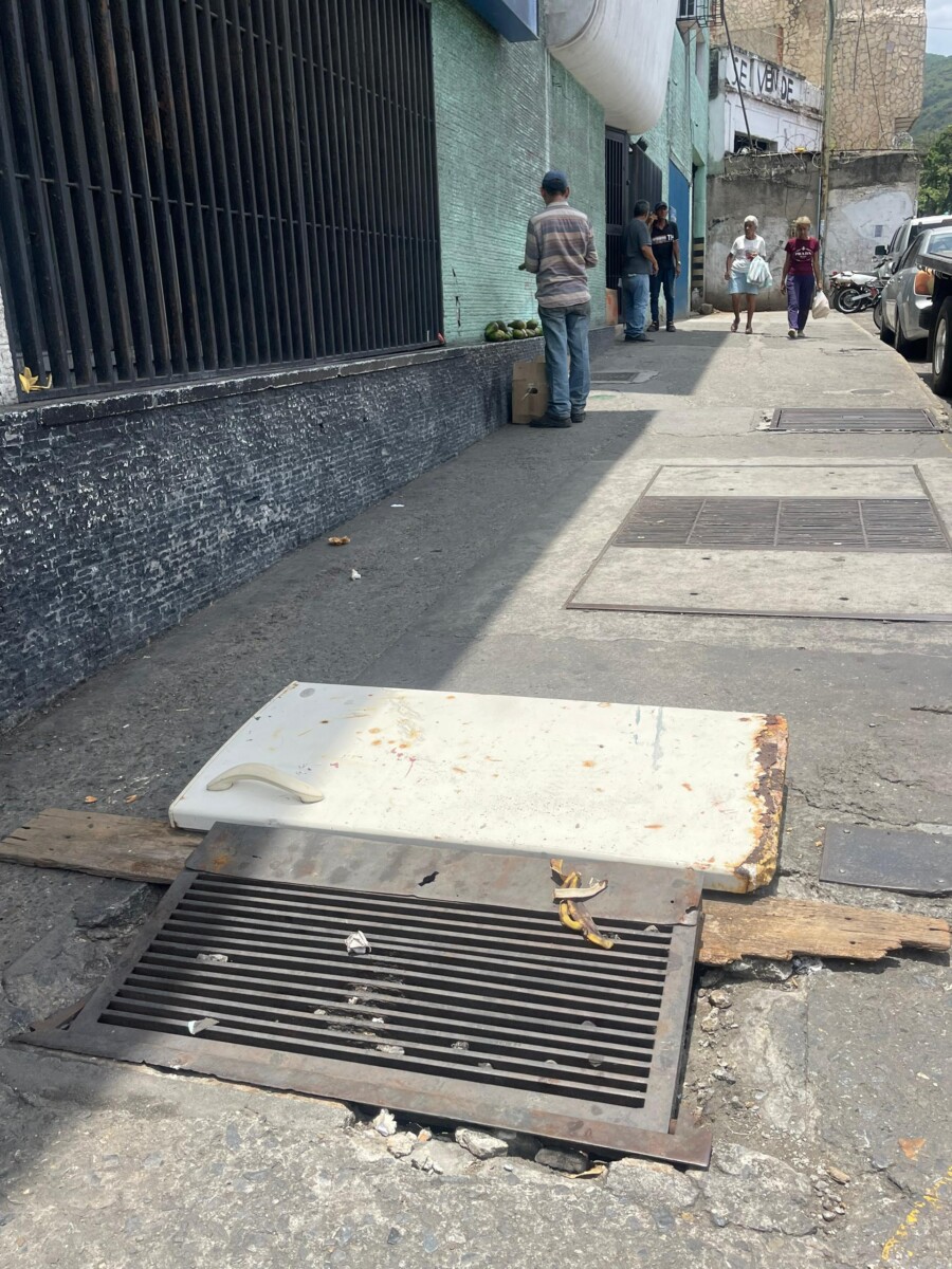 Frente al antiguo banco Mercantil en Maiquetía una alcantarilla en mal estado se ha convertido en un verdadero peligro para los peatones. Vecinos y transeúntes, cansados de esperar una solución, decidieron improvisar una tapa con tablas y plásticos, luego de que se registraran varias caídas que describen como “mortales”.