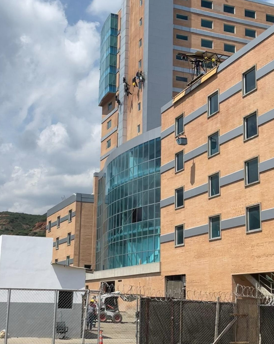 Las obras del Hotel Aeropuerto, frente al terminal internacional, avanzan con fuerza. Este martes 21 se observaron obreros con arneses limpiando paredes y ventanas a gran altura para culminar los acabados externos.