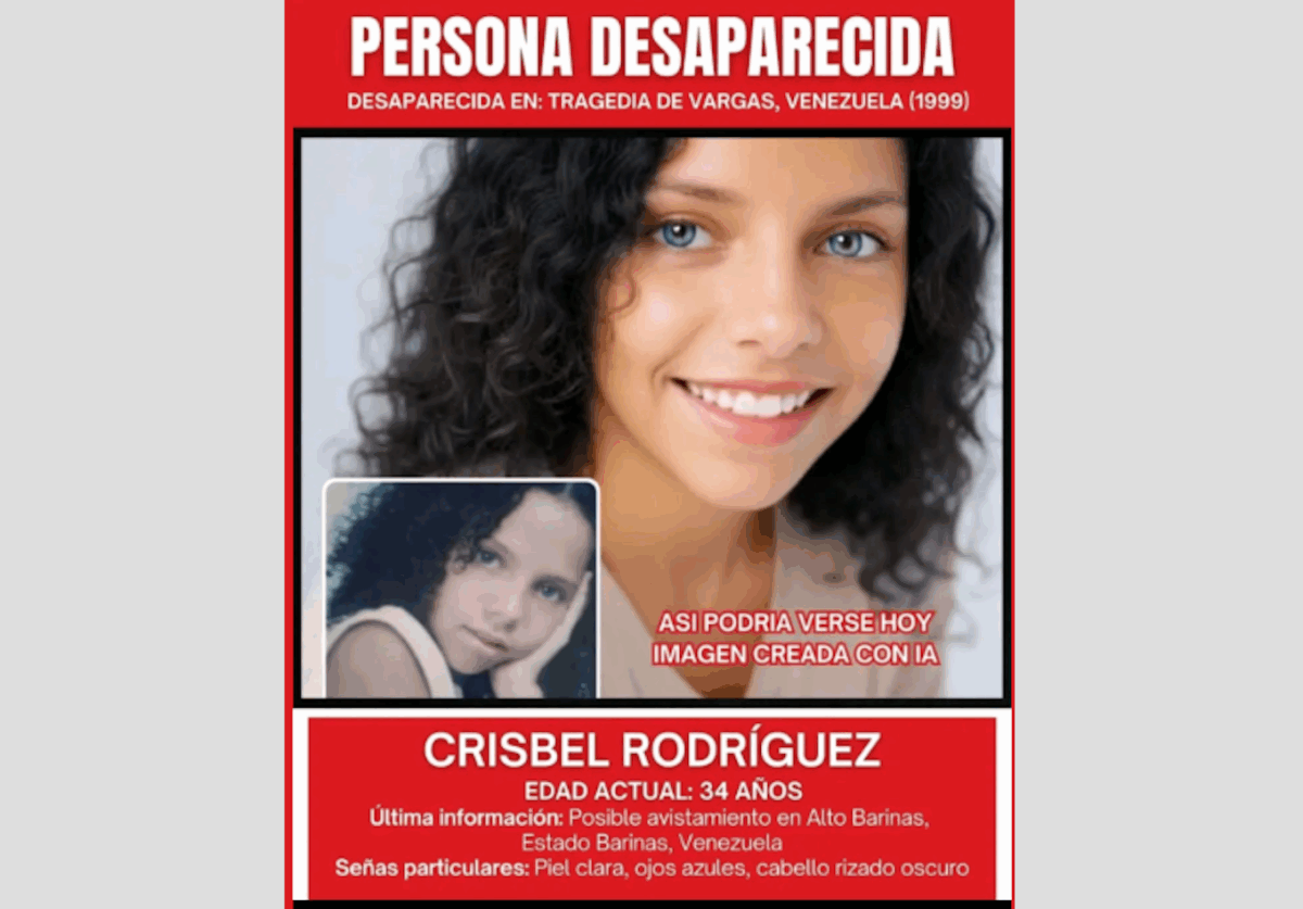 La historia de Crisbel Rodríguez Marín, una niña de 9 años de edad desaparecida durante la tragedia de Vargas en diciembre de 1999, volvió a conmover al país luego de que su madre, Crisol Marín, difundiera un retrato generado con inteligencia artificial (IA) que muestra cómo podría lucir su hija hoy, a los 35 años.